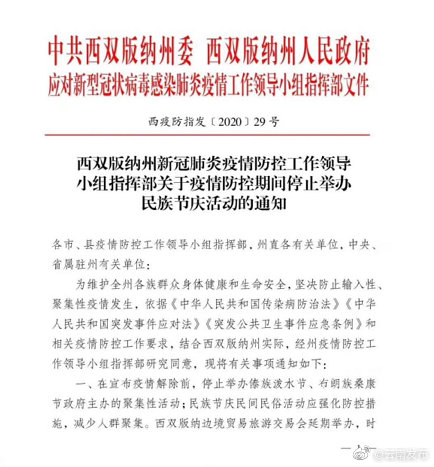 一、在宣布疫情解除前,停止举办傣族泼水节、布朗族桑康节政府主办的聚集性活动;民族节庆民间民俗活动应强化防控措施,减少人群聚集。西双版纳边境贸易旅游交易会延期举办,时间另行公告。清明节有关祭祀活动提倡从简,避免聚集性活动。