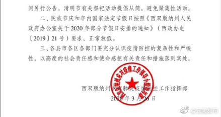 二、民族节庆和年内国家法定节假日按照《西双版纳州人民政府办公室关于 2020 年部分节假日安排的通知》(西政办电〔2019〕21 号)要求,正常放假。