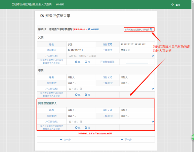 ,填写其他法定监护人信息。如下图所示:
