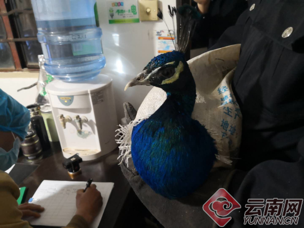 3月23日晚,云南嵩明县森林公安局接到杨桥街道上和村委会村民报警称,在上大庄一农户家的屋顶发现一只孔雀,请求森林公安局出警处置。