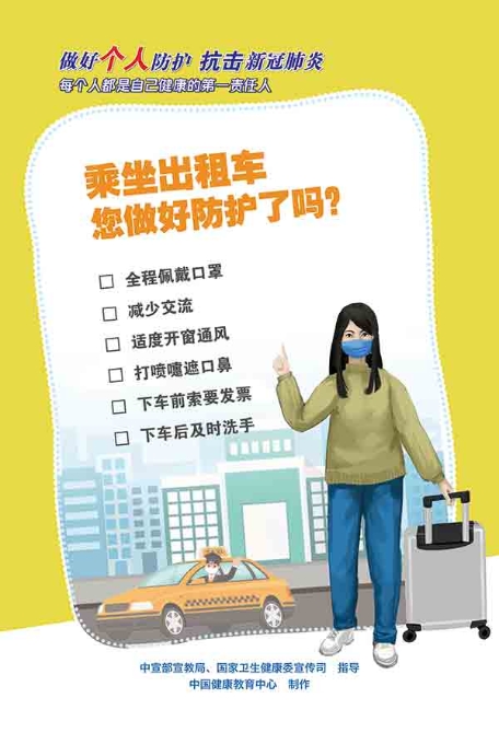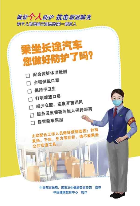 乘坐列车、飞机、地铁等公共交通时,注重个人防护是关键。我们需要全程佩戴口罩,随时配合工作人员做体温检测。保持手的卫生,在打喷嚏时需遮住口鼻,避免飞沫传播。选择“分散坐、少交流”的模式乘坐公共交通,下车后需及时洗手。需要注意的是,在乘坐出租车时,要适度开窗通风,下车前索要发票;乘坐长途汽车时,在服务区就餐要与他人保持距离,并保留乘车票据。如出现发热、干咳、乏力等症状,请不要乘坐公共交通工具。