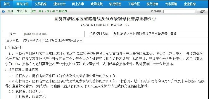 6686体育讯(昆明日报 记者孙莹)3月27日,昆明市公共资源交易平台发布了《昆明高新区东区道路沿线及节点景观绿化管养招标公告》。公告显示,为提升高新区东区道路沿线及节点景观绿化管养,将总投资5445万元对该区域进行道路绿化。