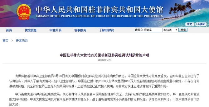 中国驻菲律宾大使馆有关援菲新冠肺炎检测试剂质量的声明
