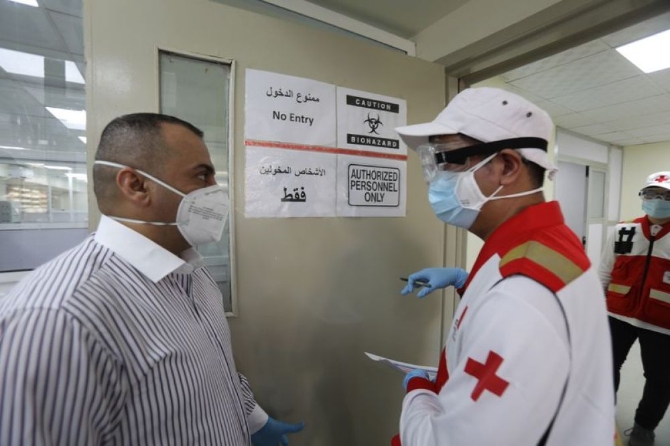 26日,新华社记者跟随中国红十字会总会援助伊拉克新冠肺炎防疫专家组成员、中山大学达安基因股份有限公司技术总监杨鸿辉,穿戴上三级防护装备,走进正超负荷运转的伊拉克中央实验室。