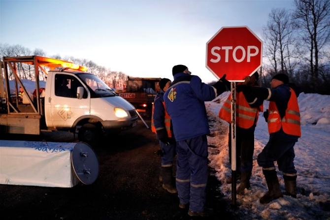 3月18日,在哈萨克斯坦努尔苏丹,工作人员在哨卡处安装“停止”标识。新华社发 奥斯潘诺夫摄
