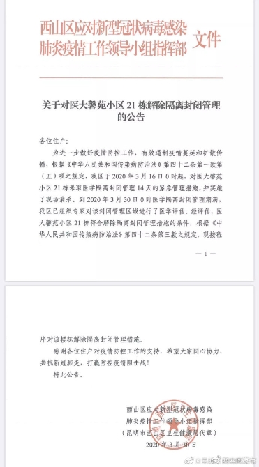 6686体育讯 机器人小明 3月30日0时起,昆明医大馨苑小区21栋医学隔离封闭管理期满,开始解除隔离封闭管理。