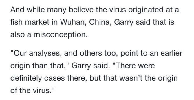 同时,尽管许多人认为该病毒起源于中国武汉的一个海鲜市场,但加里说这同样也是一个错误观点。 “我们的分析以及其他一些分析都指向了比那更早的起源。武汉那里肯定有一些病例,但绝不是该病毒的源头。”(央视新闻客户端 记者刘骁骞)