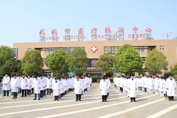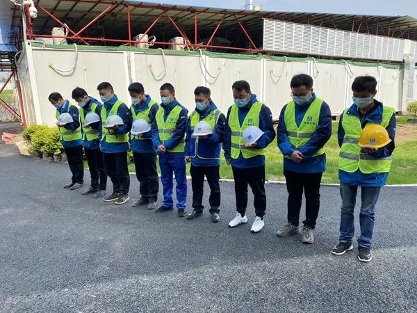 武汉雷神山医院举行哀悼活动,运营单位中南医院和维保单位中建三局一公司工作人员集体参加哀悼。(中建三局一公司供 谢沛霖 摄)