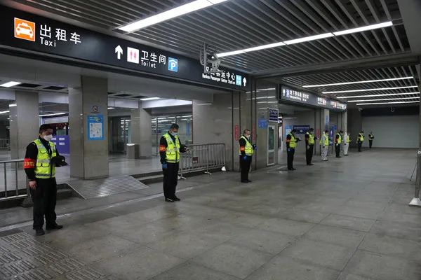 武汉市江汉区汉口火车站地区城管工作人员在地下出站口列队,深切哀悼在抗击新冠肺炎疫情斗争中牺牲的烈士和逝世的同胞。(武汉市江汉区纪委监委供 翟好斌 摄)