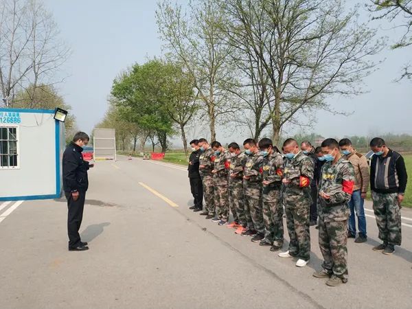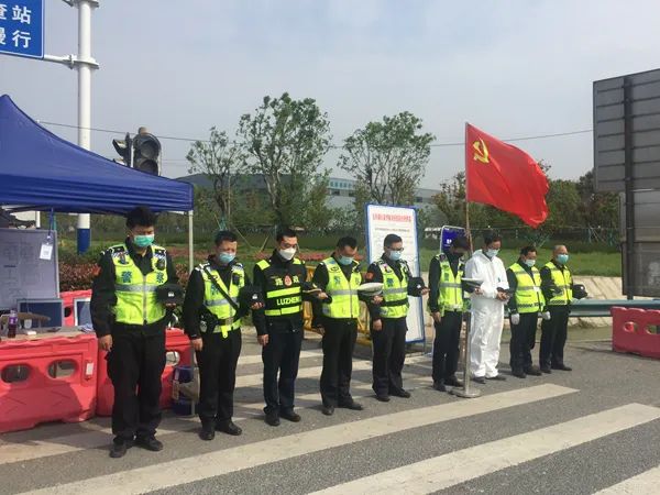 314省道通往大冶路口,驻卡点人员集体默哀。(武汉市江夏区纪委监委供 陈传良 摄)