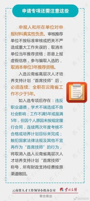 为更好的引才聚才,近日云南再放“大招”。从4月1日起,云南省正式开展2020年度云南省高层次人才引进计划和云南省高层次人才培养支持计划申报评审工作。支持力度大,引才专项多!那么申报云南“首席技师”专项都需要怎样的资格条件,申报程序是什么?戳下图了解↓↓↓(云岭先锋)