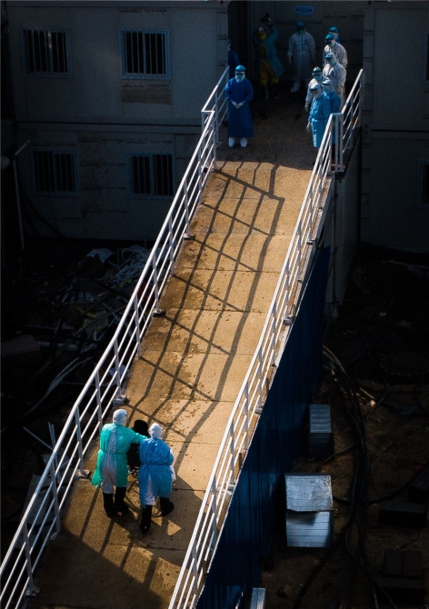 2月4日,医护人员将患者送入武汉火神山医院病房(无人机照片)。新华社记者 肖艺九 摄
