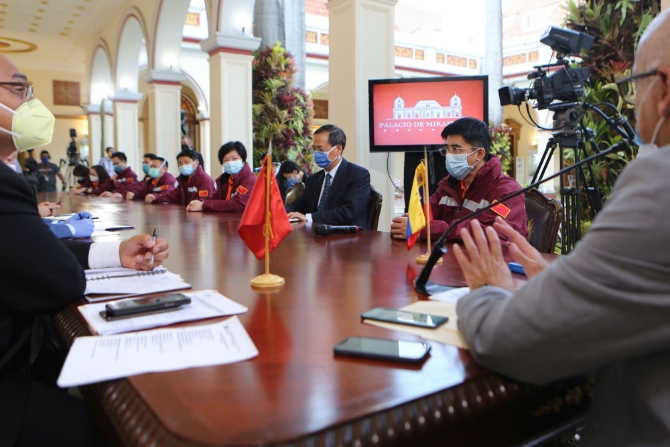 4月1日,在委内瑞拉首都加拉加斯总统府观花宫,中国抗疫医疗专家组与委内瑞拉疫情防控领导委员会举行工作会议。委内瑞拉总统府供图
