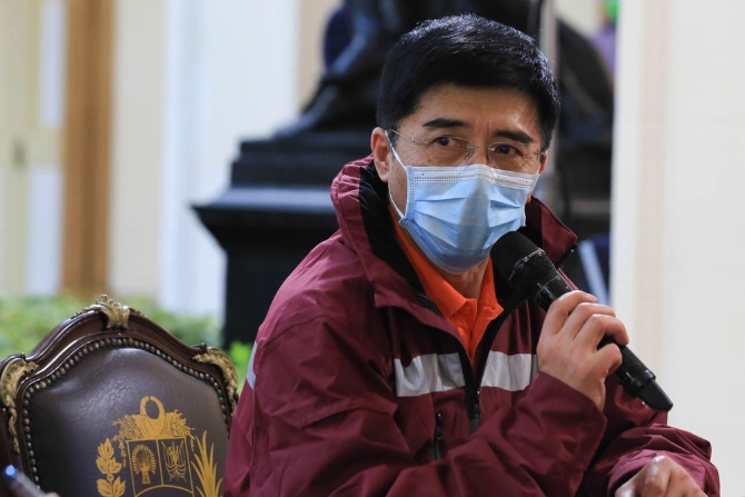 4月1日,在委内瑞拉首都加拉加斯总统府观花宫,中国抗疫医疗专家组组长黄茂在与委内瑞拉疫情防控领导委员会的工作会议上发言。委内瑞拉总统府供图