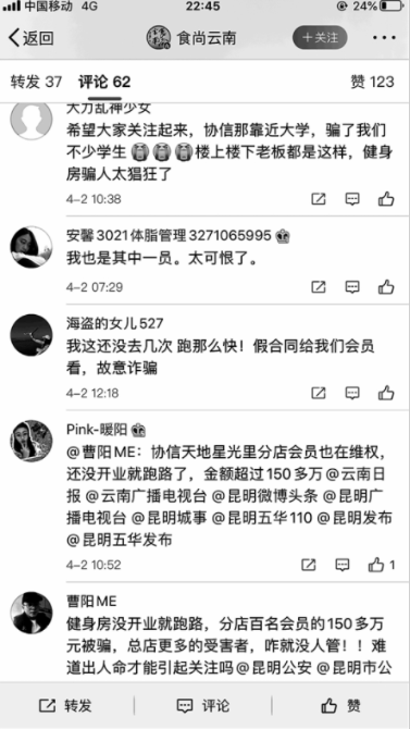 “4月1日晚,很多健身会所的办卡会员相约来到昆明市公安局官渡分局矣六派出所报警。”市民马先生气愤地说:“目前有近百人在此店办理了会员卡,之前类似的情况都是经营不善亏损什么的,这次可好,还没开业就关门了,负责人也找不到,希望有关部门能及时调查一下,联系到这家店的负责人,给我们一个交代。”