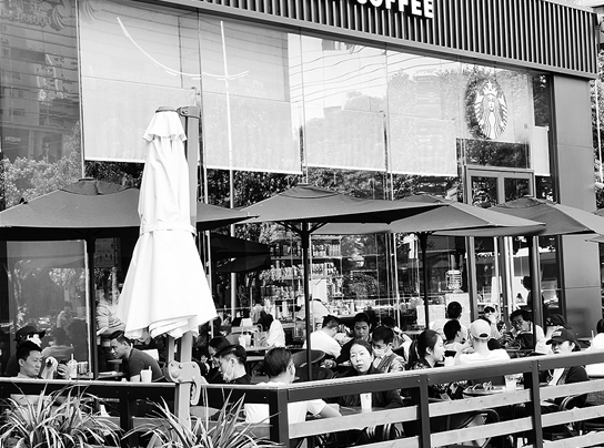 记者来到金鹰广场发现,星巴克、奈雪的茶两家店里外都坐满了消费者。