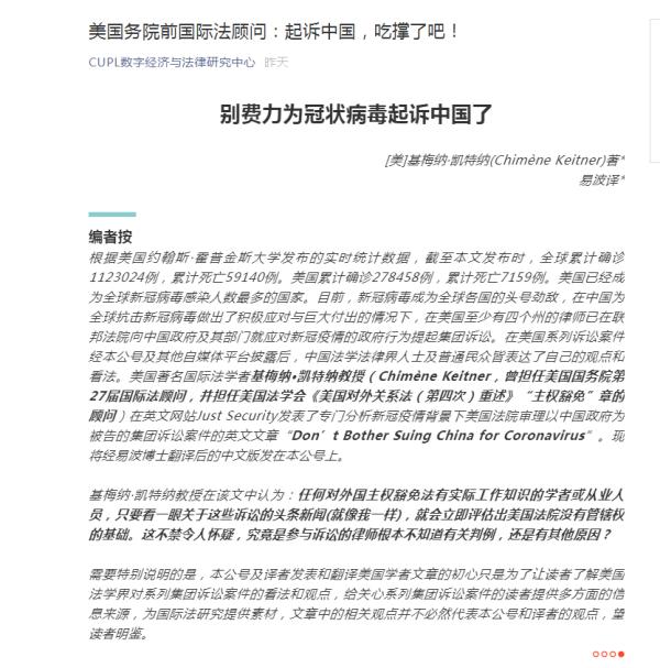 美国借疫情对中国提起诉讼的行为,在国外也引起了讨论。据外媒报道,美国国际法学者基梅纳·凯特纳日前发文表示,任何对外国主权豁免法有实际工作知识的学者或从业人员,只要看一眼关于这些诉讼的头条新闻,就会立即评估出美国法院没有管辖权的基础。