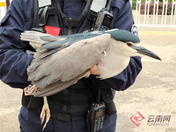 民警通过体表观察,认为此飞禽非一般鸟类,便立即联系昆明市森林公安局,请他们前往鉴定和进一步救助,同时通过下载识图软件发现该鸟名为夜鹭,属于国家二级保护动物,近年已列为全球濒危物种之一。