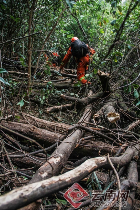 位于昆楚交界的山险峻陡峭,山里杂草丛生,荆棘遍地,树藤交织相错。在扑打昆楚交界武家箐森林火灾过程中,该支队260名指战员负责南线,不规则的、断断续续的火线增加了扑打的难度,复杂的地形和繁茂的植被交织,更是加剧了扑火的危险程度。扑打了大约2公里火线时,一个难题摆在了他们面前,由于去年大雪压倒了不少树木,十余米高的倒木交叉倒在一起,荆棘、树藤顺着倒木缠绕生长,像极了大自然编织的一张“蜘蛛网”,而火线就在这数不清的“蛛网”背后。
