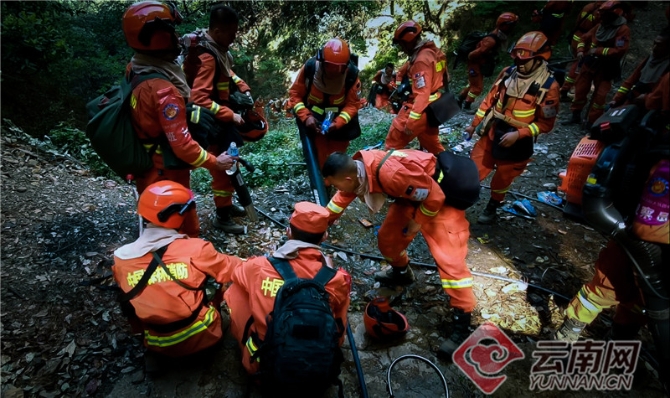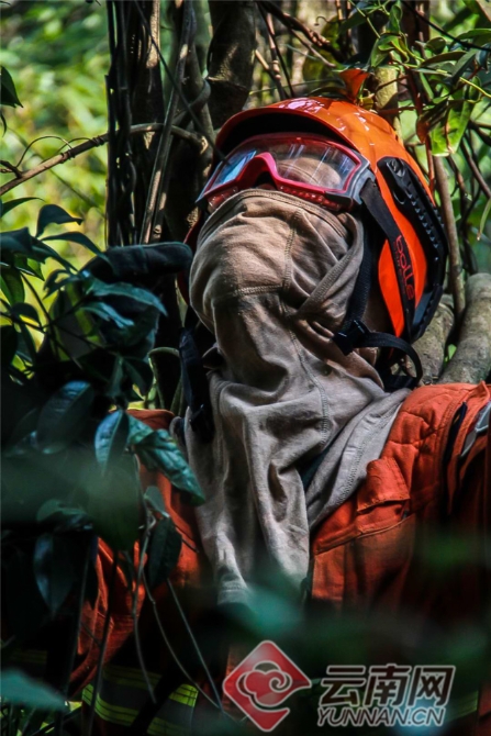 在云南扑火战斗穿梭高山沟谷是家常便饭,有经验的老消防员常挂在嘴边的一句话——“看山跑死马,接近火线远比扑救火线困难。”由于很多山路车辆根本无法通行,想要接近火线只能靠徒步前行。在接近70度的陡坡上,随时面对山石滚落、脚下打滑的情况,队员要时刻防止脚下草丛打滑而摔伤。