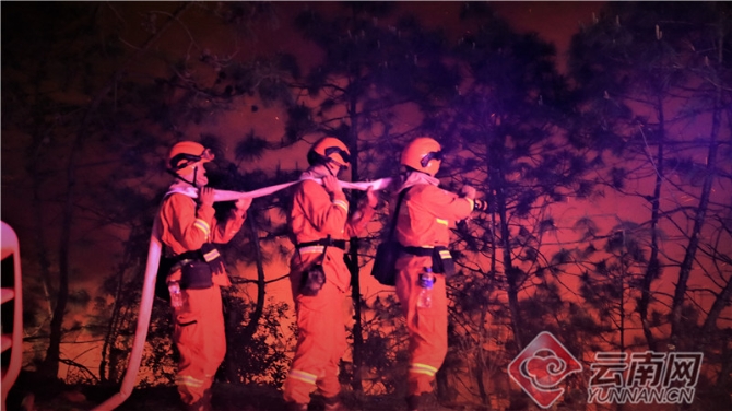 3月31日晚17时,火场联指决定在火场南线东侧机械开设隔离带阻击林火,由于火势呈树冠火,火势迅猛,蔓延速度快,预计所开设隔离带无法阻断林火向南蔓延,而此时没有足够的时间去拓宽隔离带。危急时刻,昆明市森林消防支队全体指战员请战,采取“一线推进、泵车结合”战术进行扑打阻击。