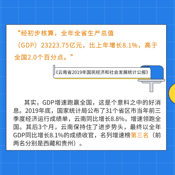 4月14日,云南省统计局、国家统计局云南调查总队发布《云南省2019年国民经济和社会发展统计公报》(以下简称《公报》)。《公报》涵盖三大产业、进出口贸易、科教文卫、资源环境等11项目内容,以详实数据客观记录我省在过去一年的发展成绩。其中,最受关注的自然是GDP。