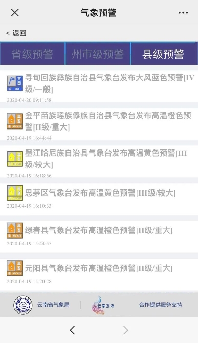 “天气预警”分为省级、州市级和县级三类预警,由云南省气象局实时发布最新预警信息,提醒民众及时做好防范措施。