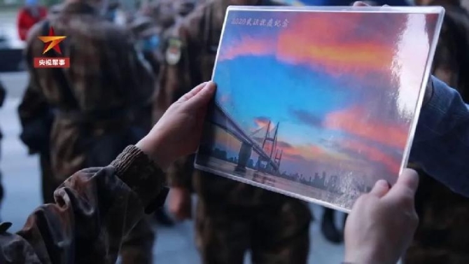 因为军队援鄂医疗队员们一直奋战在医院病房,很少有机会欣赏到武汉美丽的晚霞。酒店工作人员得知后,就找到一张武汉长江二桥的晚霞照打印出来送给队员们,希望临走前能弥补他们的遗憾。