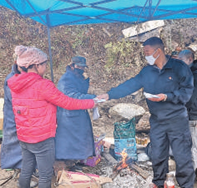 姚聪学(右)在给贫困户发口罩,并回访危改后的住房情况。资料照片