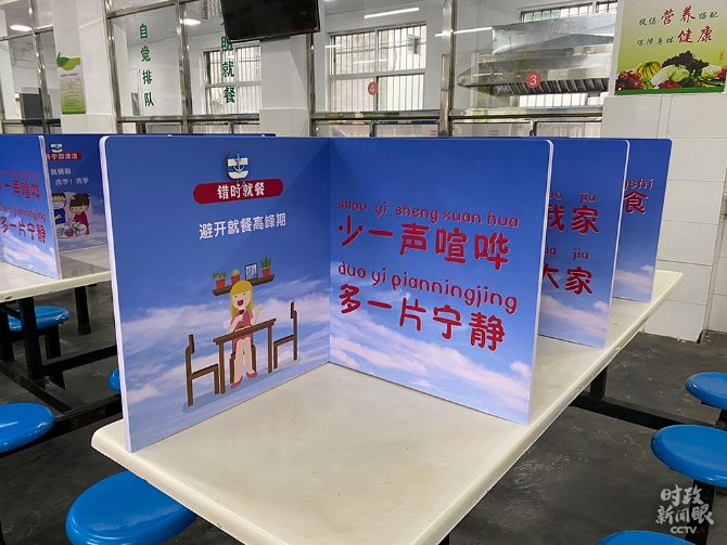 △当天,习近平专门走进学生餐厅。为了防控疫情,学生餐桌做成了这样的格子间。(总台央视记者彭汉明拍摄)