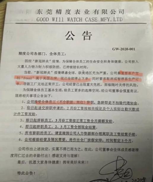 东莞泛达玩具有限公司因外贸订单取消导致业务量骤减,资金链断裂,突然宣布结业;东莞精度表业有限公司称Fossil取消或暂停原生产订单,导致公司出现重大危机,面临随时关停的风险……