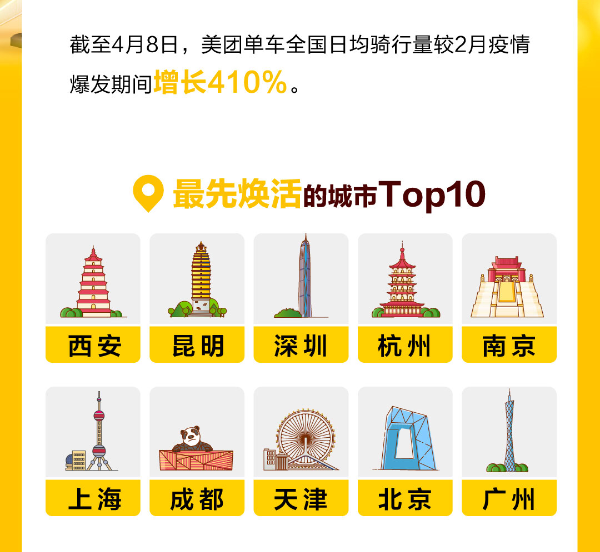 报告显示,截至4月8日,美团单车全国日均骑行量较2月疫情爆发期间增长410%。焕活最快的城市前十位分别为西安、昆明、深圳、杭州、南京、上海、成都、天津、北京和广州。据了解,昆明的骑行量基本恢复到疫情前水平,“夜活力“全国第二。