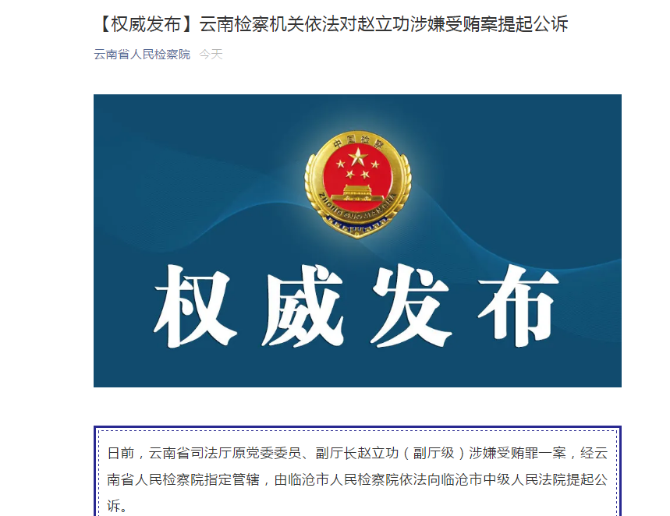 日前,云南省司法厅原党委委员、副厅长赵立功(副厅级)涉嫌受贿罪一案,经云南省人民检察院指定管辖,由临沧市人民检察院依法向临沧市中级人民法院提起公诉。
