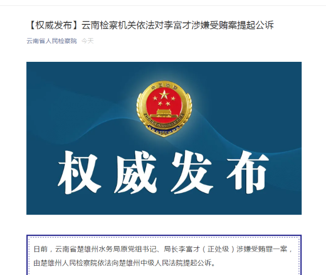 日前,云南省楚雄州水务局原党组书记、局长李富才(正处级)涉嫌受贿罪一案,由楚雄州人民检察院依法向楚雄州中级人民法院提起公诉。