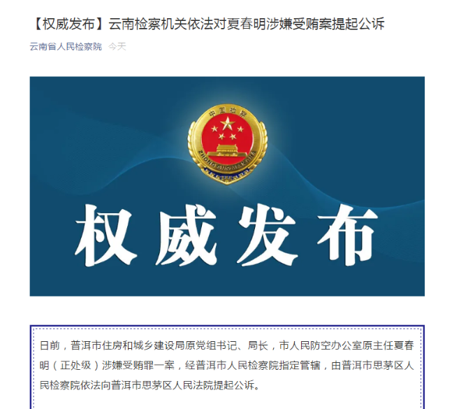 普洱市住房和城乡建设局原党组书记、局长夏春明被提起公诉