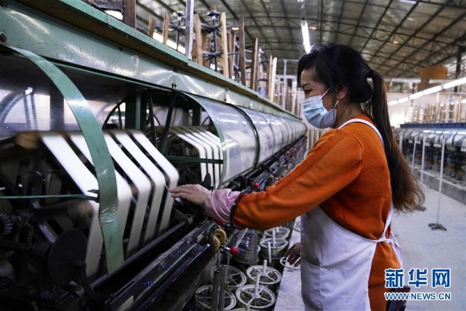 在广西隆林嘉利茧丝绸有限公司生产车间,工人在操作生产设备(4月14日摄)。新华社记者杨驰摄
