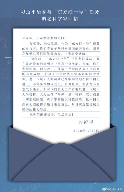 新华社北京4月24日电 在第五个“中国航天日”和“东方红一号”卫星成功发射50周年到来之际,中共中央总书记、国家主席、中央军委主席习近平4月23日给参与“东方红一号”任务的老科学家回信,向他们致以诚挚的问候,并就弘扬“两弹一星”精神、加快航天强国建设向广大航天工作者提出殷切期望。