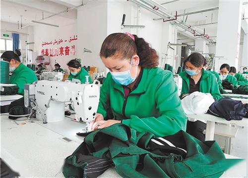 新疆和田地区洛浦县红桥小区是易地扶贫搬迁安置点,图为生活在这里的贫困户正在扶贫车间赶制服装。 本报记者 马呈忠摄