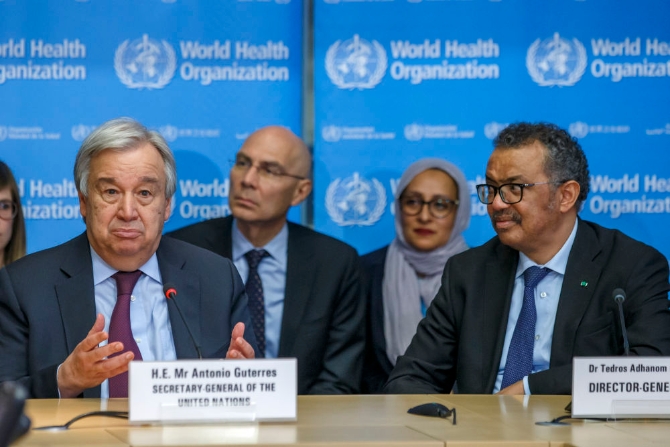 2月24日,在瑞士日内瓦,联合国秘书长古特雷斯(左)在世界卫生组织总部发表讲话。新华社发