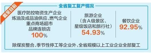 记者近日从省发展改革委新闻发布会上获悉,我省有力有序推进复工复产,多措并举加快恢复经济运行、生产生活秩序,截至目前,全省医疗防控物资生产企业、炼油及成品油供应、燃气企业和重点商场超市、品牌连锁店已100%复产;全省旅游企业(含A级景区、星级饭店和旅行社)复产54.93%,全省餐饮企业复工92.95%;除煤炭整合、季节性停工等企业外,全省规模以上工业企业已全部复工。
