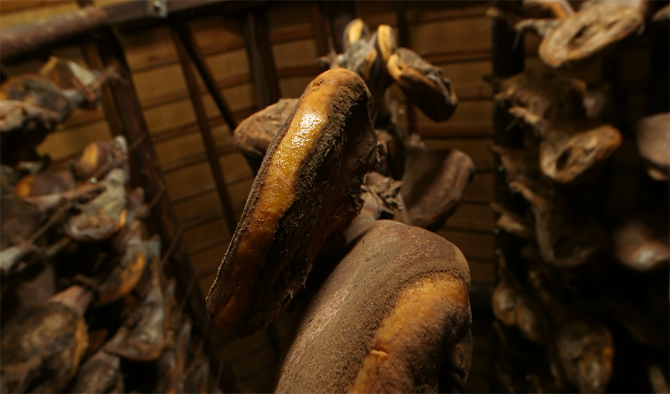 接下来把一切交给时间。10天后从锅中取出猪腿适量撒盐并翻面。继续腌制10天后将猪腿取出洗净晾干,挂在屋内通风良好的地方腌制超过8个月后,一支风味独特的宣威火腿便腌制完成了。腌制成熟的火腿有如身披绿袍,表面发绿,内里鲜香。