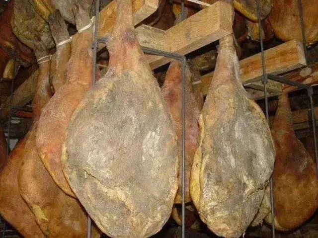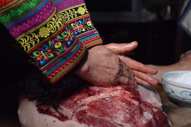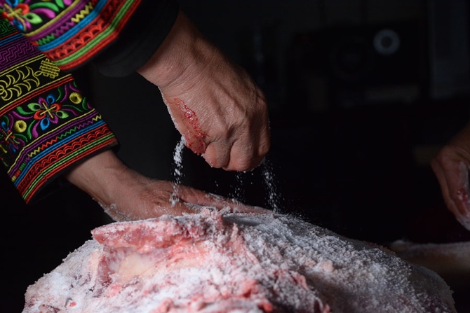 20公斤重的鲜腿需要食用盐0.5公斤,将盐洒在鲜腿表面,用手揉搓,使盐分最大程度地钻进肉里。