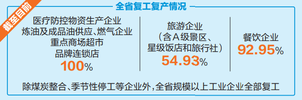 记者近日从省发展改革委新闻发布会上获悉,我省有力有序推进复工复产,多措并举加快恢复经济运行、生产生活秩序,截至目前,全省医疗防控物资生产企业、炼油及成品油供应、燃气企业和重点商场超市、品牌连锁店已100%复产;全省旅游企业(含A级景区、星级饭店和旅行社)复产54.93%,全省餐饮企业复工92.95%;除煤炭整合、季节性停工等企业外,全省规模以上工业企业已全部复工。