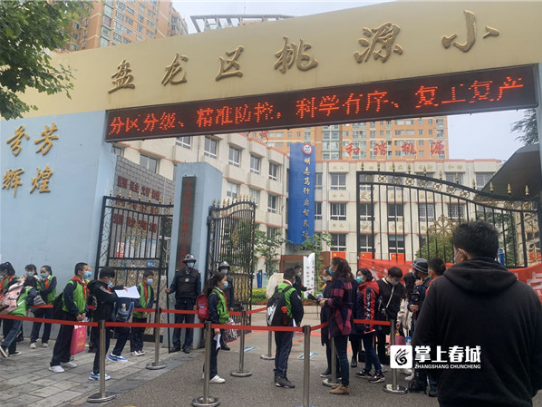 在官渡区子君中心小学门口,学校保安及老师“严阵以待”,入校门口架设着红外线测温仪,早上7点55分,同学们依次排队,在接受体温检测后有序进入学校上课。