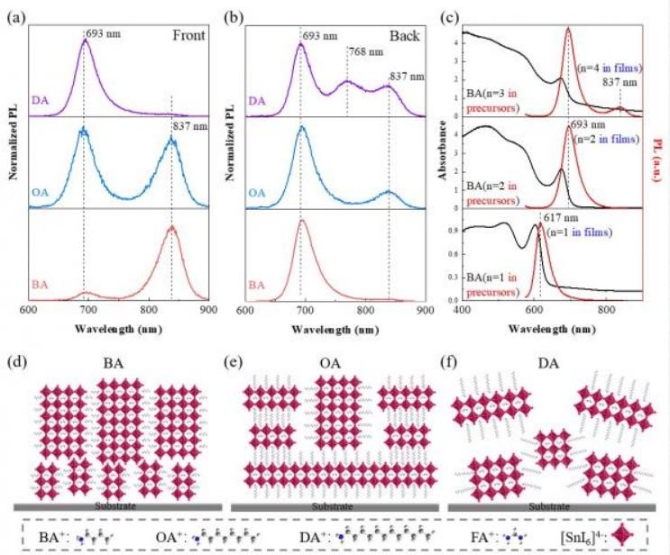 研究团队成员、电子科技大学教授刘明侦说,新型锡基钙钛矿光伏材料兼具毒性低、光吸收范围宽、载流子迁移率高等优势,成为近年来开发新型绿色太阳能电池的良好选择。但该材料体系中的二价锡离子在空气中容易自发氧化成四价锡离子,其氧化过程严重破坏了钙钛矿结构的电中性和稳定性,极大地抑制了太阳能电池的光伏性能。为解决这一问题,科研人员试图通过引入不同有机间隔阳离子来调控钙钛矿维度结构,从而提高钙钛矿电池的稳定性和光伏性能。然而,一直以来有机间隔阳离子的结构与尺寸在调节晶体取向,和保护二价锡离子不被氧化方面的作用机制不清楚,这对设计高效稳定的钙钛矿太阳能电池造成了严重阻碍。