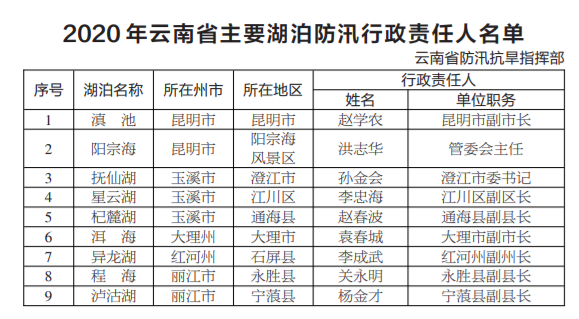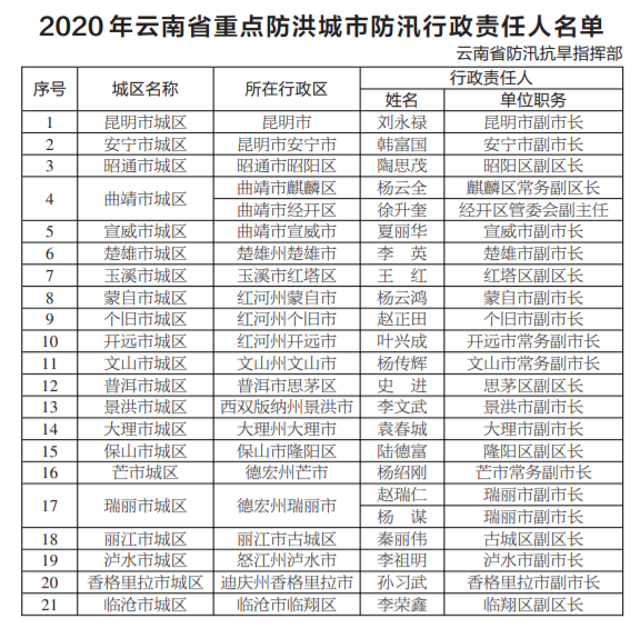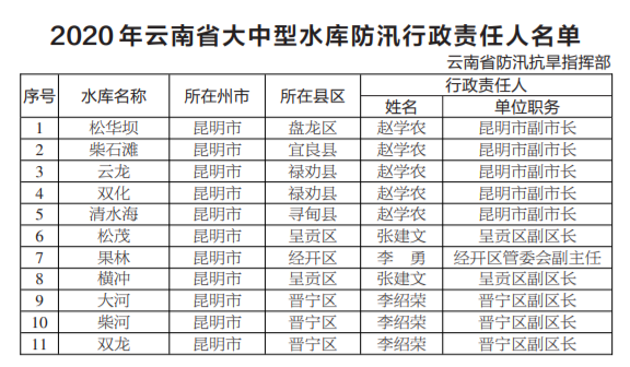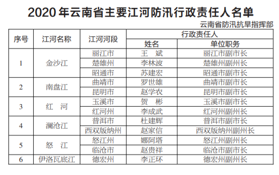 4月29日,为贯彻落实防汛抗洪、抗旱工作责任制度,切实做好2020年度防汛抗洪减灾工作的组织协调,保障2020年抗旱救灾、抗洪抢险,以及全省重要设施安全度汛等相关工作高效、有序进行,云南省防汛抗洪指挥部对外公布了2020年云南省防汛抗旱行政责任人名单向社会公布,并接受社会各界的监督。
