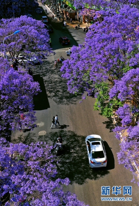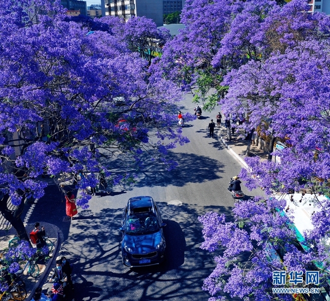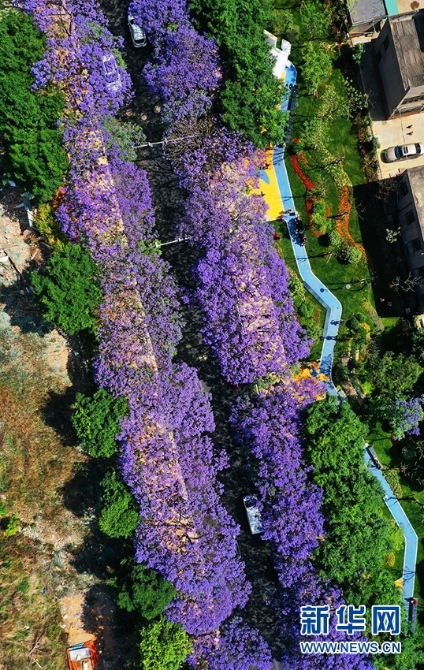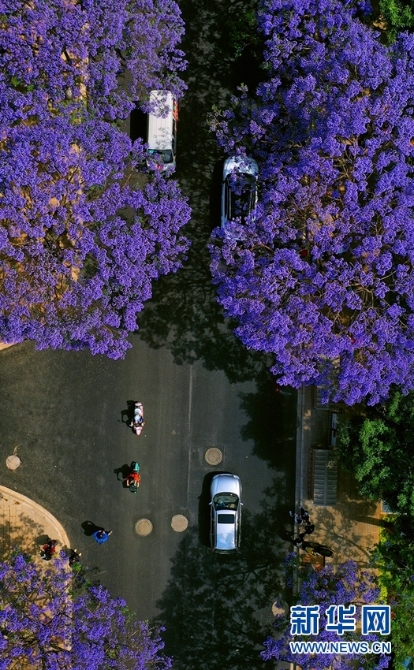 5月5日,航拍视角下的“蓝花楹大道”。新华网发(崔永江/摄)