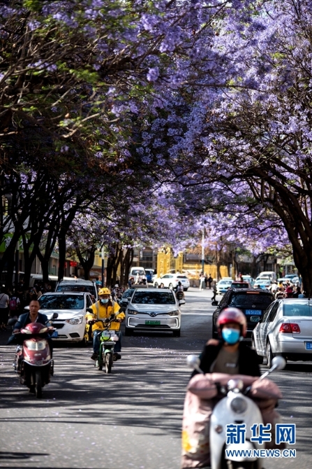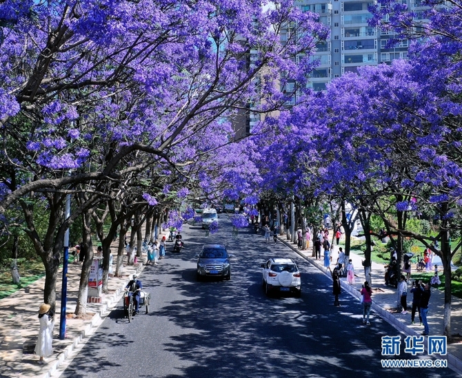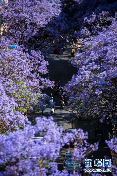 市民穿行在“蓝花楹大道”(5月6日摄)。新华网发(李明/摄)
