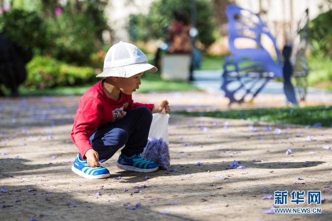 朋友在收集地上的落花(5月6日摄)。新华网发(李明/摄)