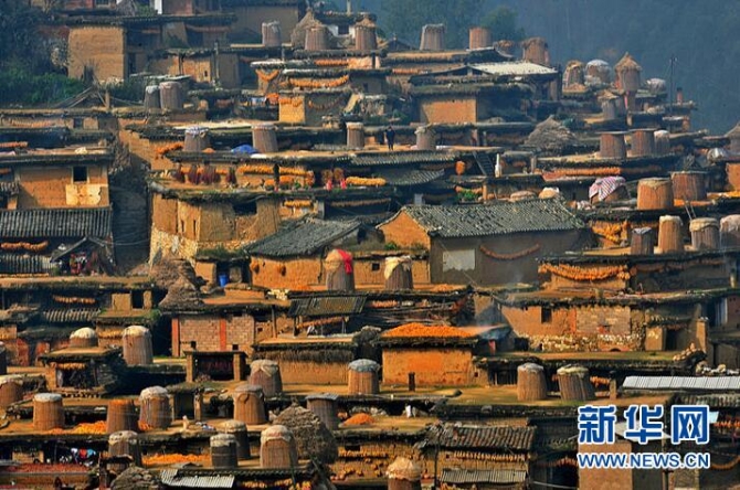 彝族土掌房以泥土为料,平台房顶,不漏雨水,又能当作晒场,冬暖夏凉,防火性能好,非常实用。